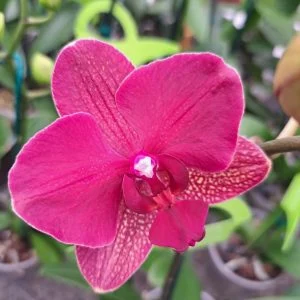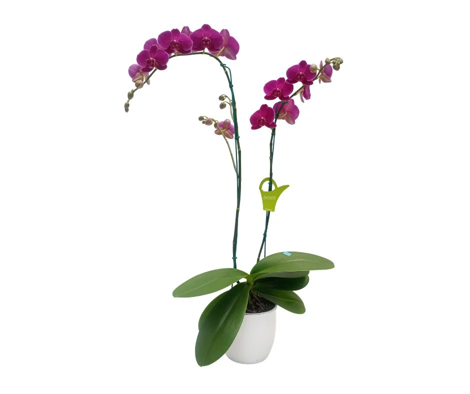 Orquidea «Bloemfontein» 2 varas. Altura entre 50 a 55cm. Flor entre 7 a 8cm. En maceta transparente #15. No incluye macetero de cerámica. Imagen referencial.
