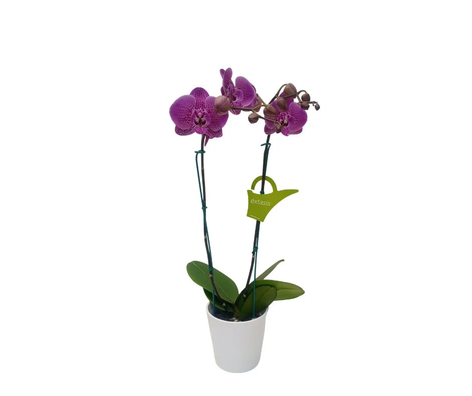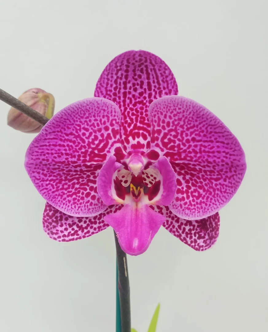 Orquidea «PINK LEOPARD». Altura entre 50 a 55cm. Flor entre 7 a 8cm. En maceta transparente #12. No incluye macetero de cerámica. Imagen referencial.