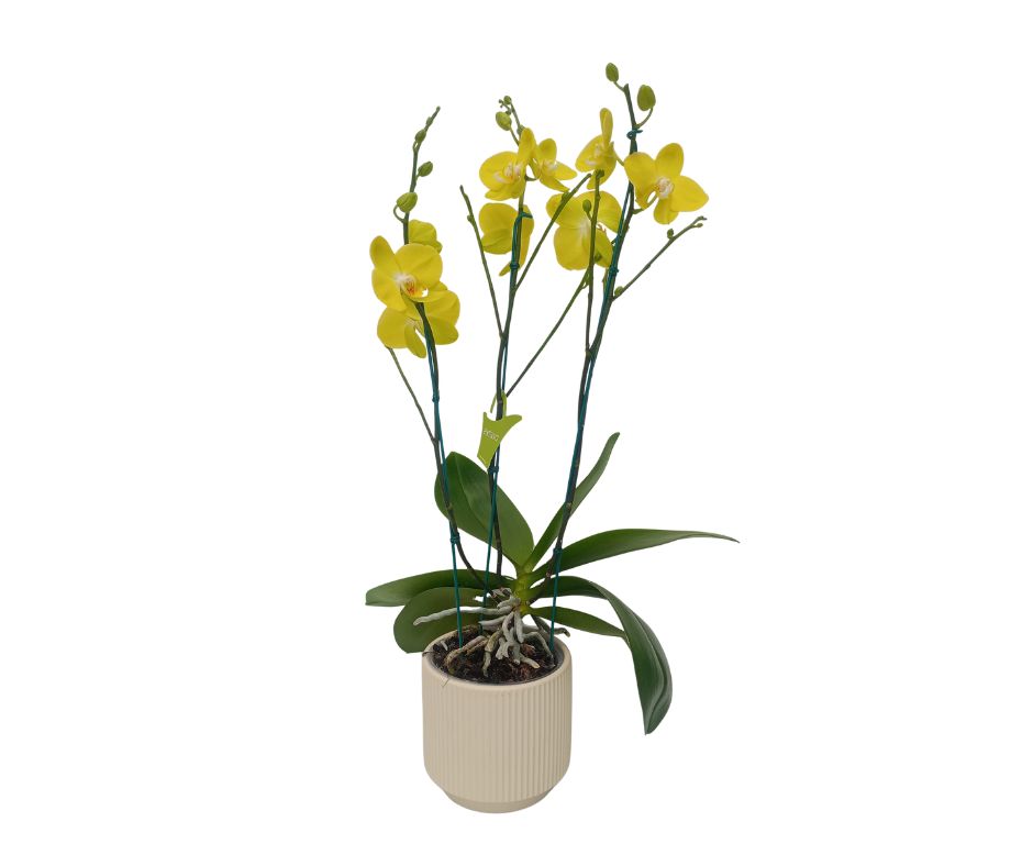 Orquidea SUMMER LIGHT 3 varas. Altura 50 a 55cm. Flor 7 a 8cm. En maceta transparente #15. No incluye macetero de cerámica. Imagen referencial.