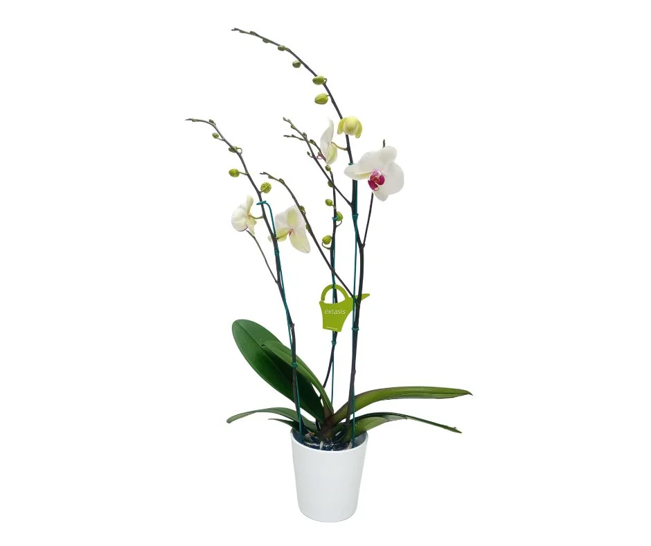 Orquídea Toronto 3 varas. Altura 60cm aprox. Flor entre 8 a 9cm. En maceta transparente #12. No incluye maceta de ceramica. Imagen Referencial.
